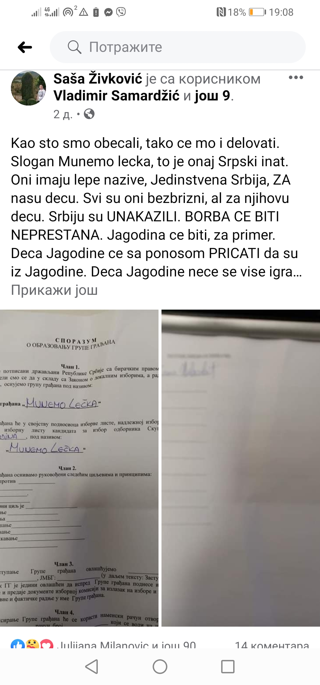 Деценије за нама обележиле су политичке нагодбе и политиканство које је као свој основни циљ имало долазак и опстанак на власти. Веома често долазило је до разочарења бирача након спознаје да су њихови изборни фаворити одустали од својих начела зарад мрвице моћи. Јагодина се већ са том ситуацијом суочавала нарочито онда када је локални Снс пристао да игра улогу „политичких пудлица“ Драгана Марковића Палме. Међутим, у последње време, својим активностима, објавама на друштвеним мрежама као и народским језиком без политичке коректности(што је можда донекле и једини могући пут) као и отвореним сукобима са првим човеком Јагодине Саша Живковић завредео је пажњу не само јагодинске јавности. Из тог разлога, као интернет портал сматрали смо да је важно известити грађане да је поступак оснивања групе грађана на чијем је Живковић челу завршен и да ће група грађана „Мунемо лечка“ сада сасвим извесно кандидат на следећим изборима за локални парламент, ма када се они буду одржавали.